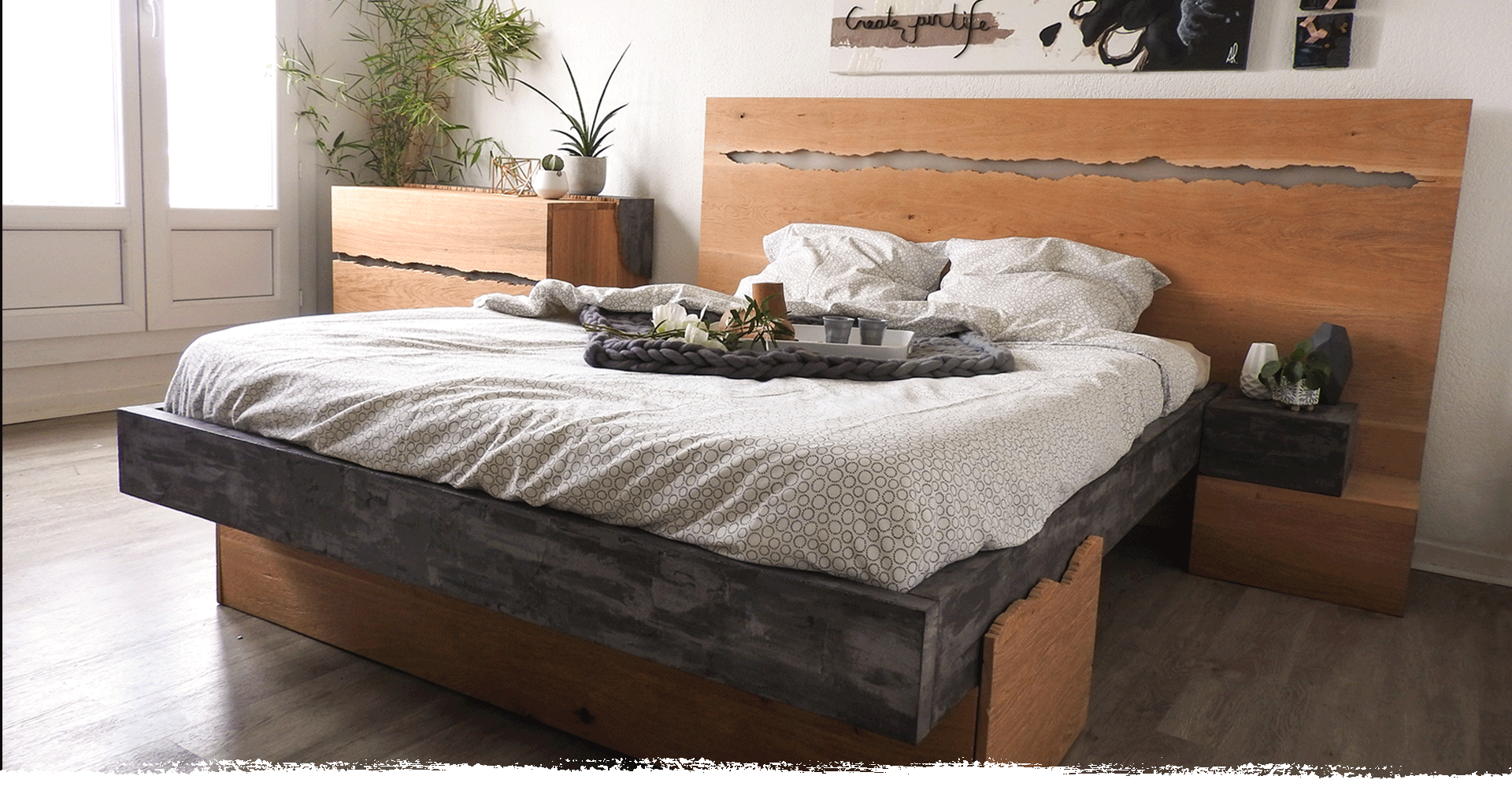 À la fois épuré et fonctionnel, ce lit puise son charme dans ses lignes sophistiquées et dans l’aspect veiné, usé de son bois de chêne associé au béton.