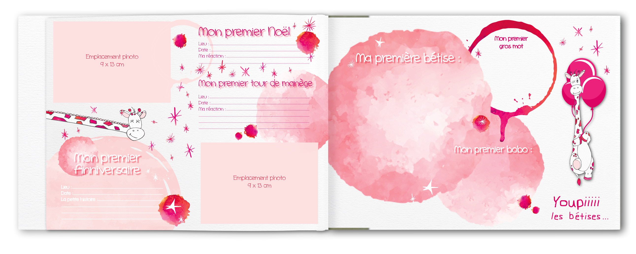 Pages à compléter avec emplacement photos à coller. Existe aussi en page personnalisée avec photos intégrées